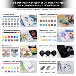 KALOUR 154 peças de materiais de arte – kit de esboço e desenho com caderno de desenho, livro tutorial, papel de colorir – grafite, colorido, carvão, aquarela e lápis metálicos – ferramentas de - Conjunto de arte abrangente de 154 peças com versatilidade e qualidade: este extenso conjunto de arte é projetado para atender a todas as suas necessidades criativas com 154 componentes de alta qualidade. Ele oferece uma impressionante seleção de lápis, pastéis, bolos de aquarela e outras ferramentas, garantindo que você tenha tudo o que precisa para criar obras de arte detalhadas e vibrantes. Perfeito para uma ampla variedade de técnicas e estilos artísticos. - Variedade de suportes de desenho: inclui 12 lápis de grafite, 12 lápis de cor fluorescentes, 4 lápis pastel, 3 lápis de carvão branco, 12 lápis de aquarela, 12 lápis de cor à base de óleo, 6 palitos pastel e 6 lápis de carvão preto. Também possui 24 bolos de aquarela e 12 lápis de cor metálicos, permitindo que você experimente diferentes meios e alcance uma variedade de efeitos em sua arte. - Ferramentas e acessórios essenciais de arte: vem com uma variedade de ferramentas úteis, incluindo 1 pincel, 1 lápis de liquidificador incolor, 1 lápis de borracha, 1 caneta pincel de aquarela, 1 caneta de gel branca e 2 raspadores de lenços umedecidos. Acessórios adicionais, como um bloco de lixa, 3 tocos de mistura de papel, 1 extensor de lápis, 20 cabeças de substituição de esponja, 1 borracha amassada, 1 apontador de plástico, 1 apontador de orifício duplo e 6 aplicadores de sombra estão incluídos para melhorar sua experiência de desenho e pintura. - Inclui vários blocos de esboço e arte: o conjunto possui 5 superfícies de arte diferentes, incluindo um caderno de esboços, um bloco de aquarela, um bloco de papel preto, um caderno de esboços bege e um bloco pastel. Também inclui um tutorial de desenho e um livro de colorir, oferecendo diversas superfícies para seus projetos criativos e orientações úteis para melhorar suas habilidades. - Ideal para artistas de todos os níveis de habilidade: seja você um artista experiente ou um iniciante, este conjunto de arte é perfeito para você. É adequado para vários empreendimentos artísticos, desde esboços detalhados até pinturas vibrantes. O conjunto é ideal para uso doméstico, sala de aula ou como um presente atencioso para entusiastas de arte. As capas de presente portáteis e elegantes facilitam levar seus materiais de arte para qualquer lugar ou apresentá-los como presente.