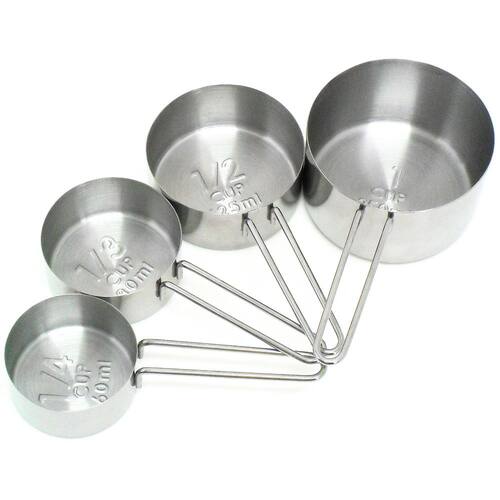 O conjunto de medidores foi concebido para simplificar as atividades culinárias, levando praticidade e beleza à cozinha. O conjunto de medidores é composto por quatro peças das seguintes medidas: 1 xícara (250 ml), 1/2 xícara (125 ml), 1/3 de xícara (80 ml) e 1/4 de xícara (60ml), todos com marcação de volume impressa, produzidos em aço inox, resistente e durável. Prepare seus pratos com mais facilidade.