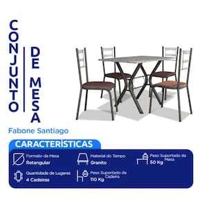Informações do Produto Faça suas refeições com muito mais estilo e praticidade, graças ao Conjunto de Mesa Santiago de 4 cadeiras. O produto oferece sofisticação sem abrir mão da simplicidade.