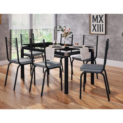Conjunto De Mesa Com 6 Cadeiras Malva Tampo De Vidro 140cm SF Preto Fosco Assento Platina Artefamol