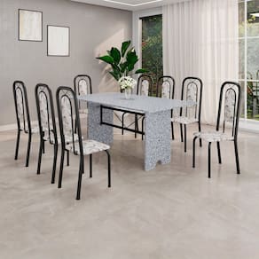 Quer deixar sua casa completa e prática? Uma dica bacana de como transformar o seu lar, deixando-o mais receptivo e bonito? Então você precisa de móveis indispensáveis para deixar seu lar muito mais aconchegante, receptivo e sempre disponível para receber a visita de amigos, familiares e convidados. Você vai se apaixonar por este incrível e moderno Conjunto de Mesa com 8 Cadeiras. Ideal para cozinha, ele é a melhor opção para completar o espaço que você desejar. Aproveite!! Medida da Mesa (A x L x P): 75,8 cm x 180 cm x 75 cm Peso da Mesa: 104,24 kg Mesa suporta até: 10.0000 Acabamento da Cadeira/Banco: Pintura Texturizada Acabamento da Mesa: Pintura Texturizada Ambiente Principal: Cozinha Cadeira/Banco Estofada: Encosto e Assento Estofados Cadeira/Banco estofada: Encosto e Assento Estofados Cadeira/Banco suporta até: 120.0000 codigo_ean: 7900288153111 Complexidade da Montagem: Baixa: pode ser montado por uma pessoa sozinha Cor: Preto/Cinza Cor do Produto: Preto/Cinza Cor Secundária: Bege De Canto (Canto Alemão): Não Enchimento do Assento: Espuma D-16 Escala de Brilho: Semi-Brilho Espessura do Tampo: 1,5 mm Estrutura do Assento: MDP Formato do Tampo: Retangular Itens Inclusos: 1 Mesa, 8 Cadeiras, Manual de Montagem e Kit Ferragens Linha ou Coleção: Lara Manual de Montagem e Instalação: https://product-hub-prd.madeiramadeira.com.br/443522689/documents/91ce8be3-6193-46b1-95bc-b0d90cbd51a580282374535281744236778593.pdf Marca: Soma Móveis Material da Base da Mesa: Aço Material da Estrutura da Cadeira: Aço Material do Tampo: Granito Medida da Cadeira/Banco (A x L x P): 105 cm x 37 cm x 40 cm Medida do Tampo (L x C x E): 180cm x 75cm x 1,5 cm Mesa Extensível: Não Necessita Montagem: Sim Origem do Produto: Nacional Peso da Cadeira/Banco: 2,7 kg Possui Apoio Para os Pés: Não Possui Suporte Giratório: Não Quantidade de Cadeiras: 8 Quantidade de Lugares: 08 Recomendações de Uso, Manutenção e Limpeza: Não permitir que molhe os pés da base, usar um pano de tecido macio e seco, evitar detergentes, alvejantes e produtos químicos de limpeza; no tampo usar tecido macio levemente umedecido. Revestimento da Cadeira/Banco: Couro Ecológico Sistema de Montagem: Parafusos Marca: Não Informado