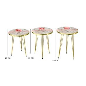 Conjunto De Mesa De Centro 4 Peças - Mármore Branco Conjunto de mesa ; de centro com 4 peças de tamanhos e alturas diferentes na cor mármore branco ; Conjunto de mesas de centroEste conjunto de mesas é versátil e adapta-se perfeitamente à sua sala de estar, por exemplo, e permite-lhe poupar espaço, pois encaixam umas nas outras. As mesas de centro são uma peça essencial de mobiliário em qualquer sala de estar, servindo como uma superfície funcional e decorativa para guardar bebidas e outros itens. Mesa de apoio ideal para as suas jarras, vasos de flores e muito mais. O conjunto de mesas de encaixe é uma opção de economia de espaço para móveis de casa ou escritório. Elas são versáteis e podem ser em uma variedade de configurações, de salas de estar a escritórios. Elas são uma ótima opção para maximizar metragem quadrada e para usar quando necessário e armazenar quando não for necessário. Conjunto composto por uma mesa oval e 3 mesas redondas.Material:- ;Tampo: MDP- Pernas: metalDimensões: (largura x comprimento)- Mesa Oval (largura x comprimento x altura): 50 x 90 x 43cm- Mesa redonda n. 1 (largura x altura): 34 x 47cm- Mesa redonda n. 2(largura x altura): 34 x 50cm- Mesa redonda n. 3(largura x altura): 34 x 55 cmCor:- Tampo: mármore branco ;- Pernas: douradoConteúdo da embalagem: 1 conjunto de 4 mesas de centro (tamanhos diferentes)Observação: Produto não vai montado e não nos responsabilizamos pela montagem.