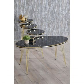 Conjunto De Mesa De Centro 4 Peças - Mármore Preto Com Dourado Conjunto de mesa ;de centro com 4 peças de tamanhos e alturas diferentes na cor marmore preto com dourado. Conjunto de mesas de centroEste conjunto de mesas é versátil e adapta-se perfeitamente à sua sala de estar, por exemplo, e permite-lhe poupar espaço, pois encaixam umas nas outras. As mesas de centro são uma peça essencial de mobiliário em qualquer sala de estar, servindo como uma superfície funcional e decorativa para guardar bebidas e outros itens. Mesa de apoio ideal para as suas jarras, vasos de flores e muito mais. O conjunto de mesas de encaixe é uma opção de economia de espaço para móveis de casa ou escritório. Conjunto Elas são versáteis e podem ser em uma variedade de configurações, de salas de estar a escritórios. Elas são uma ótima opção para maximizar metragem quadrada e para usar quando necessário e armazenar quando não for necessário. Conjunto composto por uma mesa oval e 3 mesas redondas.Material:- Tampo: MDP ; mármore preto - Pernas: ; metal dourado ; ;Dimensões: (largura x comprimento)- Mesa Oval (largura x comprimento x altura): 50 x 90 x 43cm- Mesa redonda n. 1 (largura x altura): 34 x 47cm- Mesa redonda n. 2(largura x altura): 34 x 50cm- Mesa redonda n. 3(largura x altura): 34 x 55 cmCor:- Tampo: mármore preto com dourado - Pernas: douradoConteúdo da embalagem: 1 conjunto de 4 mesas de centro (tamanhos diferentes)Observação: Produto não vai montado e não nos responsabilizamos pela montagem.