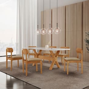 A Cadeira Bellini complementa o conjunto com conforto e sofisticação. Produzida em madeira maciça e com assento estofado, oferece estabilidade e uma experiência acolhedora à mesa. Suas linhas suaves e proporções equilibradas reforçam o estilo contemporâneo, tornando o conjunto uma escolha ideal para quem busca elegância e conforto.