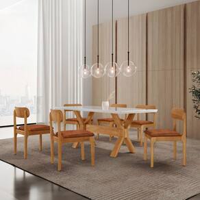 O Conjunto Bellini traduz uma estética contemporânea pensada para ambientes sofisticados, onde cada detalhe valoriza o design e o bom gosto. A Mesa Bellini possui tampo com acabamento laqueado off e canto moeda, criando uma superfície elegante e agradável ao toque. Sua estrutura em laminado de madeira cinamomo traz aconchego visual, enquanto o detalhe em X na base se destaca como elemento marcante do design, garantindo equilíbrio e personalidade à peça.