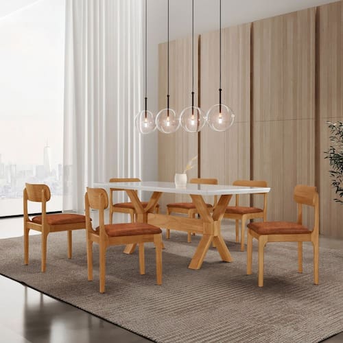 A Cadeira Bellini complementa o conjunto com conforto e sofisticação. Produzida em madeira maciça e com assento estofado, oferece estabilidade e uma experiência acolhedora à mesa. Suas linhas suaves e proporções equilibradas reforçam o estilo contemporâneo, tornando o conjunto uma escolha ideal para quem busca elegância e conforto.