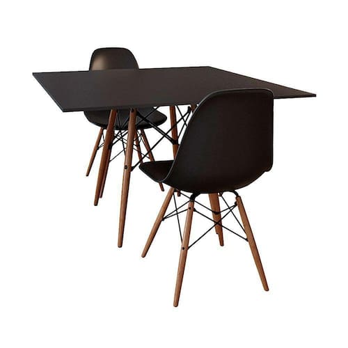 Conjunto De Mesa De Jantar Eames Eiffel Quadrada 90cm Tampo De Madeira Preto Com 2 Cadeiras PretasO Jogo de Mesa 2 Cadeiras Eames Eiffel se destaca pelo design moderno e sofisticado. A Cadeira Eames é confeccionada em policarbonato, sua base é em Madeira maciça, o que confere total resistência e conforto, o tampo da mesa é confeccionado em MDF com pintura impermeável garantindo melhor durabilidade ao produto, sua base é em Madeira maciça. Esse conjunto da vida ao ambiente além de combinar com todos os tipos e cores de móveis.Informações técnicas Conjunto:Modelo: Eames EiffelConteúdo da Embalagem: 01 Mesa e 02 Cadeiras (Embalados Separadamente).Instruções/Cuidados: Limpar com pano seco ou levemente umedecido com água.Necessita de Montagem? Sim.Mesa:Tipo: QuadradaCor: Preto Tampo: MadeiraAltura: 76cmLargura: 90cmProfundidade: 90cmCadeiras:Cor: Preta Altura: 85 cmLargura: 47 cmProfundidade: 50 cmAssento x Chão: 45 cm***OBS: As imagens representam o produto real, porém podem apresentar algumas pequenas variações de cores, dependendo do monitor/tela.Conjunto de Mesa de Jantar Eames Eiffel Quadrada 90cm Tampo de Madeira Preto com 2 Cadeiras Pretas