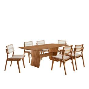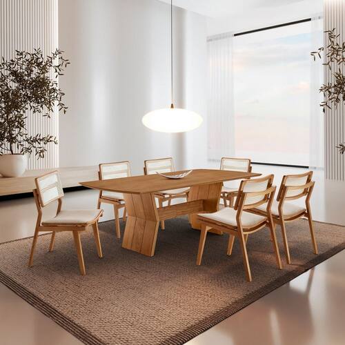 As Cadeiras Eloa Premium são fabricadas em madeira maciça, garantindo durabilidade e imponência. O encosto em rattan natural adiciona um toque artesanal e sofisticado, enquanto os assentos estofados proporcionam máximo conforto, ideais para momentos prolongados à mesa.