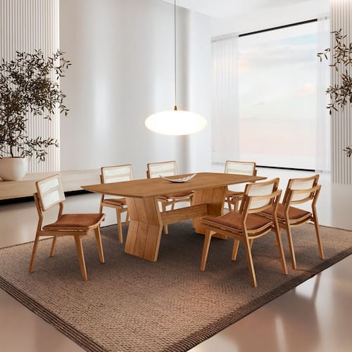 As Cadeiras Eloa Premium são fabricadas em madeira maciça, garantindo durabilidade e imponência. O encosto em rattan natural adiciona um toque artesanal e sofisticado, enquanto os assentos estofados proporcionam máximo conforto, ideais para momentos prolongados à mesa.