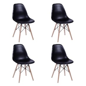 Conjunto De Mesa De Jantar Eames Eiffel Redonda 90cm Tampo De Madeira Amêndoa Com 4 Cadeiras Pretas O Jogo de Mesa 4 Cadeiras Eames Eiffel se destaca pelo design moderno e sofisticado. A Cadeira Eames é confeccionada em policarbonato, sua base é em Madeira maciça, o que confere total resistência e conforto, o tampo da mesa é confeccionado em MDF com pintura impermeável garantindo melhor durabilidade ao produto, sua base é em Madeira maciça. O Jogo de Mesa 4 Cadeiras Eames Eiffel da vida ao ambiente além de combinar com todos os tipos e cores de móveis.Tipo: ConjuntoModelo: Eames EiffelDimensões do Produto:- CadeiraCor: Preto Altura: 85 cm Largura: 47 cm Profundidade: 50 cm Assento x ChÃo: 45 cm Contém: 04 cadeiras Peso máximo suportado: 120 Kg- MesaCor: Amêndoa Altura: 76cm Di âmetro: 90cmObs: Imagens Meramente IlustrativaConjunto de Mesa de Jantar Eames Eiffel Redonda 90cm Tampo de Madeira AmÃndoa com 4 Cadeiras Pretas