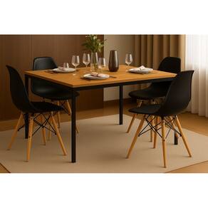 Conjunto: 1 mesa + 4 cadeiras Estilo: Moderno/Industrial Cor da mesa: Tampo amadeirado, pés pretos metálicos Cor das cadeiras: Pretas com pés de madeira e estrutura metálica Indicado para até 4 pessoas Montagem simples