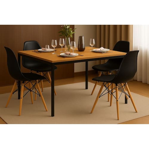 Design moderno e atemporal Estrutura metálica reforçada Tampo em madeira de alta qualidade Cadeiras Eames pretas ergonômicas e elegantes Fácil de montar e limpar Ideal para salas de jantar, cozinhas e espaços gourmet