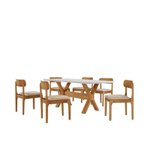 Conjunto de Mesa de Jantar Tampo 180cm Laqueado Canto Moeda 6 Cadeiras Bellini Linho OFF / Imbuia Natural / Cinamomo Imbuia/ Laqu - Branco