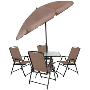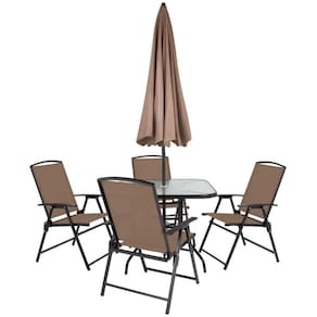 Composto por uma mesa quadrada com tampo em vidro temperado, quatro cadeiras dobráveis e um guarda-sol resistente, o conjunto foi pensado para atender às necessidades de quem deseja aproveitar momentos de lazer ao ar livre com mais comodidade. Além disso, o conjunto proporciona excelente durabilidade, já que tanto a mesa quanto as cadeiras são fabricadas em aço com pintura epóxi, garantindo resistência contra desgastes do uso cotidiano. O tampo de vidro temperado agrega segurança e estilo, enquanto as cadeiras possuem tela de composição mista em 70% PVC e 30% poliéster, oferecendo conforto e praticidade na hora de sentar.