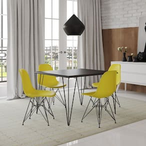 Conjunto de Mesa Eames Clips de Ferro Preto Tampo Preto 120x75 4 Cadeiras Ferro Preta Assento Amarelo o Jogo de Mesa 4 Cadeiras Eames Clips Se Destaca Pelo Design Moderno e Sofisticado. a Cadeira Eames Eiffel É Confeccionada em Polipropileno, Sua Base É em Ferro, o Que Confere Total Resistência e Conforto. o Jogo de Mesa 4 Cadeiras Eames Clips da Vida Ao Ambiente Além de Combinar com Todos Os Tipos e Cores de Móveis. Caracteristicas Cadeira Tipo: Cadeira Modelo: Eiffel Cor: Amarelo Base: Ferro na Cor Preta Dimensões do Produto Altura: 85 Cm Largura: 47 Cm Profundidade: 50 Cm Assento X Chão: 45 Cm Contém: 04 Cadeiras Caracteristicas Mesa Tipo: Mesa Modelo: Clips Cor: Preto Base: Ferro na Cor Preta Dimensões do Produto Altura: 75cm Largura: 120cm Profundidade: 75cm Obs: Imagens Meramente Ilustrativa