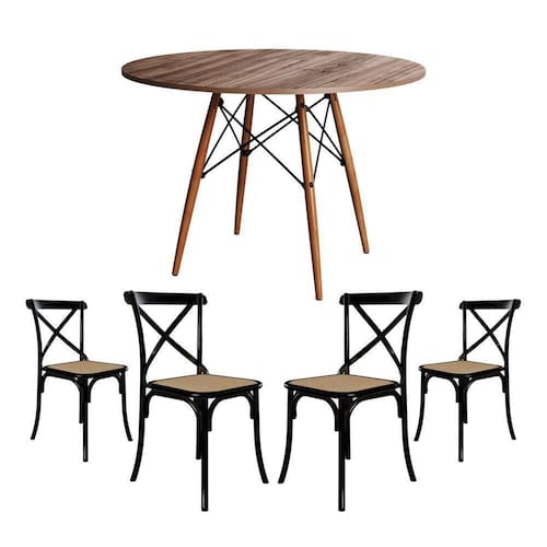 Conjunto De Mesa Eiffel Redondo Tampo De Madeira 110cm Amêndoa Com 4 Cadeiras Katrina em Aço Preto Assento BegeA sua cozinha ou sala de jantar ficará completa com esse lindo Conjunto de Mesa e Cadeiras! Contendo um design de móveis moderno, elegante e com uma ousada combinação de cores, esse é um kit que certamente é uma solução que esbanja estilo, elegância e muito requinte.O conjunto tem em sua diversificada estrutura de materiais com altíssima qualidade, que proporciona muito mais resistência, mesmo com o passar dos anos, e com seus 4 assentos Katrina Aço é ideal para um jantar em família sem abrir mão do conforto. O Kit acompanha versatilidade e combina com vários tipos de decoração, o que dá mais praticidade em sua casa.Informações técnicas Conjunto:Conteúdo da Embalagem: 01 Mesa e 04 Cadeiras (Embalados Separadamente).Instruções/Cuidados: Limpar com pano seco ou levemente umedecido com água.Necessita de Montagem? Sim.Mesa:Modelo: Eiffel WoodTipo: Redonda // QuadradaCor do tampo: AmêndoaCor da base dos pés: Wood (Madeira)Material do tampo: Madeira Material dos pés: MadeiraDimensões: Altura: 76 cm // Largura: 110 cm // Profundidade: 110 cmCadeiras:Modelo: KatrinaCor: Preta e BegeMaterial da estrutura: Aço com Pintura E-PoxMaterial do assento: Espuma D14 com Revestimento em Corano.Dimensões: Altura: 90 cm // Largura: 50 cm // Profundidade: 55 cmConjunto de Mesa Eiffel Redondo Tampo de Madeira 110cm AmÃndoa com 4 Cadeiras Katrina Preto Assento