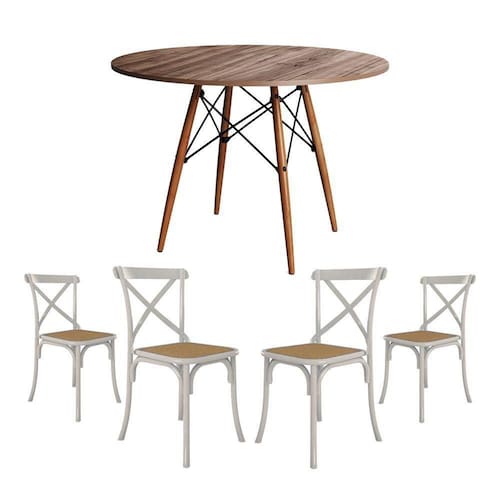 Conjunto De Mesa Eiffel Redondo Tampo De Madeira 90cm Amêndoa Com 4 Cadeiras Katrina Aço Branca AssentoA sua cozinha ou sala de jantar ficará completa com esse lindo Conjunto de Mesa e Cadeiras! Contendo um design de móveis moderno, elegante e com uma ousada combinação de cores, esse é um kit que certamente é uma solução que esbanja estilo, elegância e muito requinte.O conjunto tem em sua diversificada estrutura de materiais com altíssima qualidade, que proporciona muito mais resistência, mesmo com o passar dos anos, e com seus 4 assentos Katrina Aço é ideal para um jantar em família sem abrir mão do conforto. O Kit acompanha versatilidade e combina com vários tipos de decoração, o que dá mais praticidade em sua casa.Informações técnicas Conjunto:Conteúdo da Embalagem: 01 Mesa e 04 Cadeiras (Embalados Separadamente).Instruções/Cuidados: Limpar com pano seco ou levemente umedecido com água.Necessita de Montagem? Sim.Mesa:Modelo: Eiffel WoodTipo: RedondaCor do tampo: AmêndoaCor da base dos pés: Wood (Madeira)Material do tampo: MadeiraMaterial dos pés: MadeiraDimensões: Altura: 76 cm // Largura: 90 cm // Profundidade: 90 cmCadeiras:Modelo: KatrinaCor: Branca e BegeMaterial da estrutura: Aço com Pintura E-PoxMaterial do assento: Espuma D14 com Revestimento em Corano.Dimensões: Altura: 90 cm // Largura: 50 cm // Profundidade: 55 cmConjunto de Mesa Eiffel Redondo Tampo de Madeira 90cm AmÃndoa com 4 Cadeiras Katrina Branca Assento