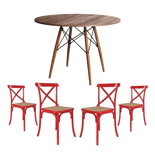 Conjunto De Mesa Eiffel Redondo Tampo De Madeira 90cm Amêndoa Com 4 Cadeiras Katrina Vermelha Assent