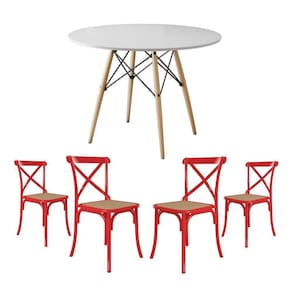 Conjunto De Mesa Eiffel Redondo Tampo De Madeira 90Cm Branco Com 4 Cadeiras Katrina Vermelhao