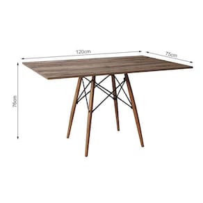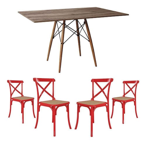 Conjunto De Mesa Eiffel Retangular Tampo De Madeira 120x75cm Amêndoa Com 4 Cadeiras em Aço Katrina Azul Turquesa A sua cozinha ou sala de jantar ficará completa com esse lindo Conjunto de Mesa e Cadeiras! Contendo um design de móveis moderno, elegante e com uma ousada combinação de cores, esse é um kit que certamente é uma solução que esbanja estilo, elegância e muito requinte.O conjunto tem em sua diversificada estrutura de materiais com altíssima qualidade, que proporciona muito mais resistência, mesmo com o passar dos anos, e com seus 4 assentos Katrina Aço é ideal para um jantar em família sem abrir mão do conforto. O Kit acompanha versatilidade e combina com vários tipos de decoração, o que dá mais praticidade em sua casa sem abrir mão de um espaço a mais na mesa.Informações técnicas Conjunto:Conteúdo da Embalagem: 01 Mesa e 04 Cadeiras (Embalados Separadamente).Instruções/Cuidados: Limpar com pano seco ou levemente umedecido com água.Necessita de Montagem? Sim.Mesa:Modelo: Eiffel WoodTipo: RetangularCor do tampo: AmêndoaCor da base dos pés: Wood (Madeira)Material do tampo: MadeiraMaterial dos pés: MadeiraDimensões: Altura: 76 cm // Largura: 120 cm // Profundidade: 75 cmCadeiras:Modelo: KatrinaCor: Azul Noturno e BegeMaterial da estrutura: Aço com Pintura E-PoxMaterial do assento: Espuma D14 com Revestimento em Corano.Dimensões: Altura: 90 cm // Largura: 50 cm // Profundidade: 55 cmConjunto de Mesa Eiffel Retangular Tampo de Madeira 120x75cm AmÃndoa com 4 Cadeiras Katrina Azul Tur