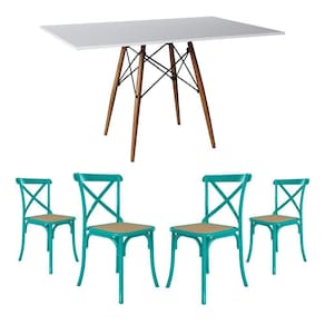 Conjunto De Mesa Eiffel Retangular Tampo De Madeira 120x75cm Branco Com 4 Cadeiras Katrina Azul TurqA sua cozinha ou sala de jantar ficará completa com esse lindo Conjunto de Mesa e Cadeiras! Contendo um design de móveis moderno, elegante e com uma ousada combinação de cores, esse é um kit que certamente é uma solução que esbanja estilo, elegância e muito requinte.O conjunto tem em sua diversificada estrutura de materiais com altíssima qualidade, que proporciona muito mais resistência, mesmo com o passar dos anos, e com seus 4 assentos Katrina Aço é ideal para um jantar em família sem abrir mão do conforto. O Kit acompanha versatilidade e combina com vários tipos de decoração, o que dá mais praticidade em sua casa.Informações técnicas Conjunto:Conteúdo da Embalagem: 01 Mesa e 04 Cadeiras (Embalados Separadamente).Instruções/Cuidados: Limpar com pano seco ou levemente umedecido com água.Necessita de Montagem? Sim.Mesa:Modelo: Eiffel WoodTipo: RetangularCor do tampo: Branco Cor da base dos pés: Wood (Madeira)Material do tampo: Madeira Material dos pés: MadeiraDimensões: Altura: 76 cm // Largura: 120 cm // Profundidade: 75 cm Cadeiras:Modelo: KatrinaCor: Azul Turquesa e BegeMaterial da estrutura: Aço com Pintura E-PoxMaterial do assento: Espuma D14 com Revestimento em Corano.Dimensões: Altura: 90 cm // Largura: 50 cm // Profundidade: 55 cmConjunto de Mesa Eiffel Retangular Tampo de Madeira 120x75cm Branco com 4 Cadeiras Katrina Azul Turq