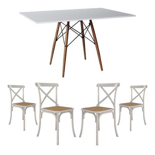 Conjunto De Mesa Eiffel Retangular Tampo De Madeira 120x75cm Branco Com 4 Cadeiras Katrina Branca AsA sua cozinha ou sala de jantar ficará completa com esse lindo Conjunto de Mesa e Cadeiras! Contendo um design de móveis moderno, elegante e com uma ousada combinação de cores, esse é um kit que certamente é uma solução que esbanja estilo, elegância e muito requinte.O conjunto tem em sua diversificada estrutura de materiais com altíssima qualidade, que proporciona muito mais resistência, mesmo com o passar dos anos, e com seus 4 assentos Katrina Aço é ideal para um jantar em família sem abrir mão do conforto. O Kit acompanha versatilidade e combina com vários tipos de decoração, o que dá mais praticidade em sua casa.Informações técnicas Conjunto:Conteúdo da Embalagem: 01 Mesa e 04 Cadeiras (Embalados Separadamente).Instruções/Cuidados: Limpar com pano seco ou levemente umedecido com água.Necessita de Montagem? Sim.Mesa:Modelo: Eiffel WoodTipo: RetangularCor do tampo: Branco Cor da base dos pés: Wood (Madeira)Material do tampo: Madeira Material dos pés: MadeiraDimensões: Altura: 76 cm // Largura: 120 cm // Profundidade: 75 cmCadeiras:Modelo: KatrinaCor: Branca e BegeMaterial da estrutura: Aço com Pintura E-PoxMaterial do assento: Espuma D14 com Revestimento em Corano.Dimensões: Altura: 90 cm // Largura: 50 cm // Profundidade: 55 cmConjunto de Mesa Eiffel Retangular Tampo de Madeira 120x75cm Branco com 4 Cadeiras Katrina Branca As