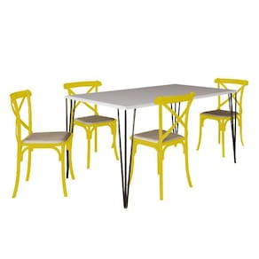 Conjunto De Mesa Elen Retangular Tampo De Madeira 140x80cm Branco Com 4 Cadeiras Katrina em Aço Amarela Assento BegeA sua cozinha ou sala de jantar ficará completa com esse lindo Conjunto de Mesa e Cadeiras! Contendo um design de móveis moderno, elegante e com uma ousada combinação de cores, esse é um kit que certamente é uma solução que esbanja estilo, elegância e muito requinte.O conjunto tem em sua diversificada estrutura de materiais com altíssima qualidade, que proporciona muito mais resistência, mesmo com o passar dos anos, e com seus 4 assentos Katrina Aço é ideal para um jantar em família sem abrir mão do conforto. O Kit acompanha versatilidade e combina com vários tipos de decoração, o que dá mais praticidade em sua casa sem abrir mão de um espaço a mais na mesa.Informações técnicas Conjunto:Conteúdo da Embalagem: 01 Mesa e 04 Cadeiras (Embalados Separadamente).Instruções/Cuidados: Limpar com pano seco ou levemente umedecido com água.Necessita de Montagem? Sim.Mesa:Modelo: ElenTipo: RetangularCor do tampo: Branco Cor da base dos pés: PretoMaterial do tampo: Madeira Dimensões: Altura: 76 cm // Largura: 140 cm // Profundidade: 80 cmCadeiras:Modelo: KatrinaCor: Amarela e BegeMaterial da estrutura: Aço com Pintura E-PoxMaterial do assento: Espuma D14 com Revestimento em Corano.Dimensões: Altura: 90 cm // Largura: 50 cm // Profundidade: 55 cmConjunto de Mesa Elen Retangular Tampo de Madeira 140x80cm Branco com 4 Cadeiras Katrina Amarela Ass