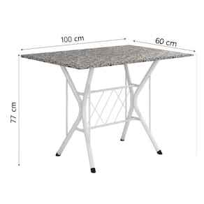 MARCA: Artefamol MODELO: Conjunto de Mesa Itália New 1,00m com 4 Cadeiras COR: Branco/Granito MATERIAL: Base e Cadeira de Aço TAMPO MESA: Granito ASSENTO: Tecido corino PESO MESA: 64,8kg (Base + Tampo) PESO CADEIRA: 3,83kg CADEIRAS SUPORTAM: 100kg MESA SUPORTA: 100kg PÉS: Sapatas de borracha ITENS INCLUSOS: 1 Base, 1 Tampo e 4 Cadeiras Montagem não inclusa. Entregamos até a porta de entrada da casa do cliente ou até a portaria do condomínio.