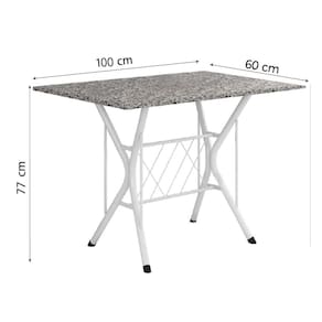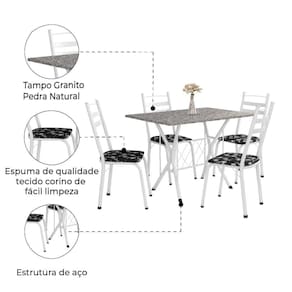 MARCA: Artefamol MODELO: Conjunto de Mesa Itália New 1,00m com 4 Cadeiras COR: Branco/Granito MATERIAL: Base e Cadeira de Aço TAMPO MESA: Granito ASSENTO: Tecido corino PESO MESA: 64,8kg (Base + Tampo) PESO CADEIRA: 3,83kg CADEIRAS SUPORTAM: 100kg MESA SUPORTA: 100kg PÉS: Sapatas de borracha ITENS INCLUSOS: 1 Base, 1 Tampo e 4 Cadeiras não inclusa. mos até a porta de entrada da casa do cliente ou até a portaria do condomínio. MEDIDAS MESA: A: 77 cm L: 100 cm P: 60 cm | MEDIDAS CADEIRA: A: 95,5 cm L: 44,3 cm P: 40 cm | MODELO: Conjunto de Mesa Itália New 1,00m com 4 Cadeiras | MARCA: Artefamol | COR: Branco/Granito | MATERIAL: Base e Cadeira de Aço | TAMPO MESA: Granito | ASSENTO: Tecido corino | PESO MESA: 64,8kg | PESO CADEIRA: 3,83kg | CADEIRAS SUPORTAM: 100kg | MESA SUPORTA: 100kg | PÉS: Sapatas de borracha | ITENS INCLUSOS: 1 Base, 1 Tampo e 4 Cadeiras | OBSERVAÇÃO: não inclusa. mos até a porta de entrada da casa do cliente ou até a portaria do condomínio. Cor: Branco / Floral Preto