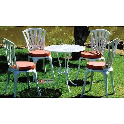 Especificações: 1 Mesa: 65 cm de altura x 60 cm de diâmetro. 4 Cadeiras: 82 cm de altura x 38 cm de diâmetro. Cor: Branco. Material: Alumínio fundido. Tipo de pintura: Eletrostática. Vendemos almofadas separadamente. Requer montagem.