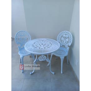 Com o conceito de prático, leve e resistente, o Conjunto Itália com 2 Cadeiras e Mesa de 3 Pés com a estrutura em alumínio fundido e com um lindo designer que combina tanto com o seu jardim quanto sua varanda ou até mesmo sua sala (Porque não!), para ambientes leves e rústicos. Com a "Pintura Eletrostática", que caracteriza-se pela elevada resistência à corrosão, ferrugem e oxidação podendo ser exposto a sol e chuva, e sem falar na praticidade para sua limpeza tornando seu produto com aquele aspecto de novo por muito mais tempo.