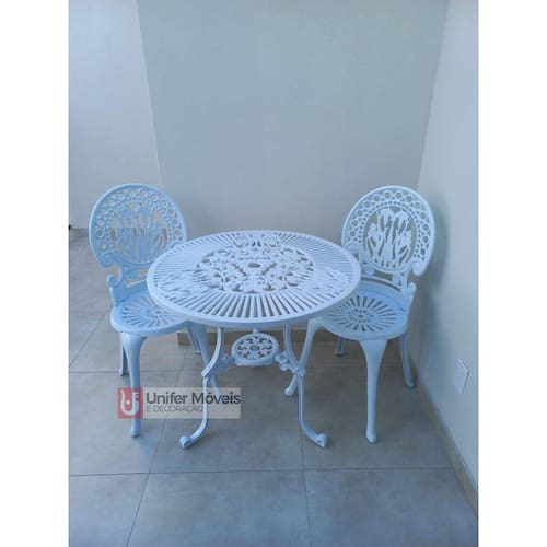 Especificações: 1 Mesa: 70 cm de altura x 75 cm de diâmetro. 2 Cadeiras: 92 cm de altura x 38 cm de diâmetro. Cor: Branco. Material: Alumínio fundido. Tipo de pintura: Eletrostática. Vendemos almofadas separadamente. Requer montagem.