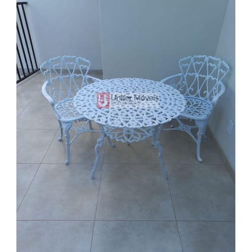 Especificações: 1 Mesa: 71 cm de altura x 80 cm de diâmetro. 2 Poltronas: 83 cm de altura x 41 cm de profundidade x 55 cm de largura. Cor: Branco. Material: Alumínio fundido. Tipo de pintura: Eletrostática. Vendemos almofadas separadamente. Requer montagem.