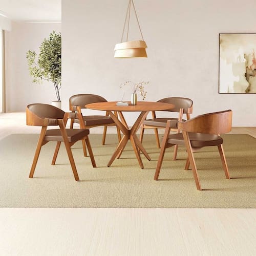 * Acabamento natural que valoriza os Medida da Mesa (A x L x P): 73,5 x 108 x 108 Peso da Mesa: 20 kg Mesa suporta até: 20 kg Acabamento da Cadeira/Banco: Verniz Natural Acabamento da Mesa: Verniz Ambiente Principal: Sala de Jantar Apoio para Braços Estofado: Não Cadeira/Banco Estofada: Encosto e Assento Estofados Cadeira/Banco estofada: Encosto e Assento Estofados Cadeira/Banco Suporta Até: 120.0000 Cadeira/Banco suporta até: 120 kg codigo_ean: 7900288279927 Configuração do Conjunto: Mesa com Cadeiras Cor: Marrom/Freijó Cor da Base: Natural Cor das Cadeiras: Marrom Cor do Produto: Marrom/Freijó Cor do Tampo: Natural Cor Secundária: Marrom De Canto (Canto Alemão): Não Design da Base: Em X Enchimento do Assento: Espuma D-28 Escala de Brilho: Brilhante Espessura do Tampo: 50 mm Estrutura do Assento: Eucalipto Estrutura do Encosto: Couro Ecológico Formato do Tampo: Redondo Informações Complementares: Utilizar aspirador de pó, escova com cerdas macias ou limpeza a seco. Não utilizar produtos químicos, abrasivos ou limpeza a vapor. Evitar exposição prolongada ao sol. Itens Inclusos: 1 Mesa e 4 Cadeiras Linha ou Coleção: Gaia Manual de Montagem e Instalação: https://product-hub-prd.madeiramadeira.com.br/799502505/documents/0e6c03e9-4006-41df-8e27-b862b18383953299310518817617602122935.pdf Marca: Zurc Decor Material da Base da Mesa: Madeira Maciça Material da Estrutura da Cadeira: Madeira Maciça Material do Tampo: Madeira Maciça Material Principal: Madeira Maciça Material Principal das Cadeiras/Bancos: Madeira Maciça Medida da Cadeira/Banco (A x L x P): 80 x 60 x 58 Medida do Tampo (L x C x E): 108 x 108 x 5 Mesa Dobrável: Não Mesa Extensível: Não Necessita Montagem: Não Origem do Produto: Nacional Peso da Cadeira/Banco: 15 kg Possui Apoio para Braços: Sim Possui Apoio Para os Pés: Não Possui Vidro: Não Quantidade de Cadeiras: 4 Quantidade de Lugares: 04 Recomendações de Uso, Manutenção e Limpeza: Utilizar aspirador de pó, escova com cerdas macias ou limpeza a seco. Não utilizar produtos químicos, abrasivos ou limpeza a vapor. Evitar exposição prolongada ao sol. Revestimento da Cadeira/Banco: Couro Ecológico Tipo de Encosto: Fixo Tipo de Madeira Maciça da Base da Mesa: Eucalipto Tipo de Madeira Maciça do Tampo: Eucalipto Marca: Não Informado