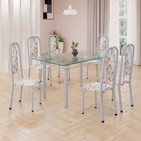 Este conjunto de mesa retangular e 6 cadeiras oferece estilo e praticidade. Com estrutura tubular em aço para estabilidade, o tampo em vidro adiciona sofisticação e resistência a riscos e manchas. As cadeiras combinam harmoniosamente com a mesa, garantindo conforto com estofamento. Ideal para diversos espaços, é perfeito para receber convidados ou desfrutar de refeições em família, criando um ambiente acolhedor e elegante. Medida da Mesa (A x L x P): 74,9 cm x 75 cm x 140 cm Peso da Mesa: 20,18 kg Mesa suporta até: 10 kg Acabamento da Cadeira/Banco: Pintura Texturizada Acabamento da Mesa: Polido Ambiente Principal: Sala de Jantar Cadeira/Banco estofada: Somente Assento Estofado Cadeira/Banco suporta até: 120 kg Complexidade da Montagem: Baixa: pode ser montado por uma pessoa sozinha Cor: Arabesco/ Mart Pérola Cor do Produto: Arabesco/ Mart Pérola Escala de Brilho: Semi-Brilho Espessura do Tampo: 6 mm Estrutura do Assento: Assento em MDP de 15mm c/ couríssimo. Itens Inclusos: 1 Mesa, 6 Cadeiras, Manual de Montagem e Ferragens. Manual de Montagem e Instalação: https://product-hub-prd.madeiramadeira.com.br/917857/documents/ce9922ea-785e-465e-a843-1325582097e92040633524617181306017506.pdf Material da Base da Mesa: Aço Material da Estrutura da Cadeira: Aço Material do Tampo: Vidro Medida da Cadeira/Banco (A x L x P): 108 cm x 37 cm x 40 cm Medida do Tampo (L x C x E): 75 cm x 140 cm x 0,6 cm Necessita Montagem: Sim Origem do Produto: Nacional Peso da Cadeira/Banco: 3,82 kg Possui Apoio Para os Pés: Não Quantidade de Lugares: 06 Recomendações de Uso, Manutenção e Limpeza: Usar um pano de tecido macio e seco, evitar detergentes, alvejantes e produtos químicos de limpeza; no tampo usar tecido macio levemente umedecido. Sistema de Montagem: Parafusos Vidro Temperado: Sim