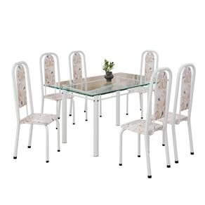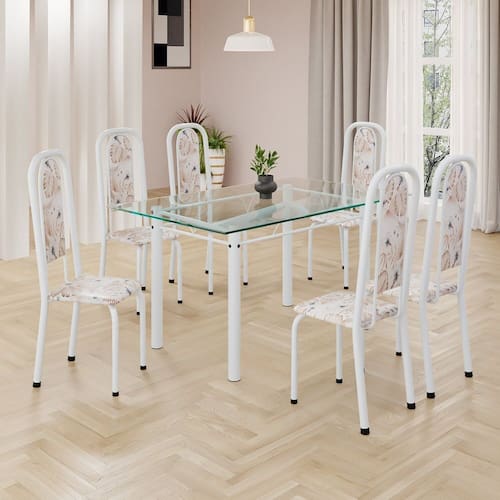 Conjunto de Mesa Retangular 140x75cm Tampo de Vidro 6 Cadeiras Lavínea Botanic Bege / Branco