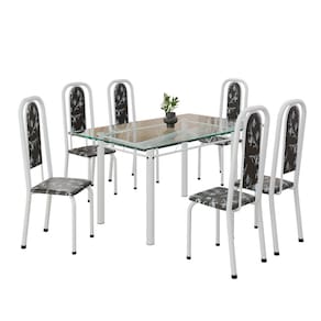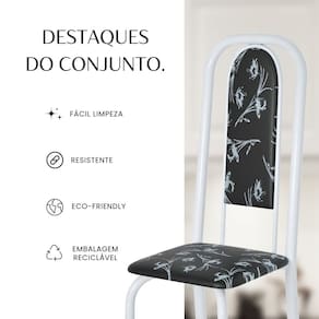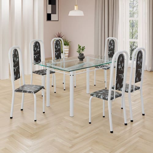 Este conjunto de mesa retangular e 6 cadeiras oferece estilo e praticidade. Com estrutura tubular em aço para estabilidade, o tampo em vidro adiciona sofisticação e resistência a riscos e manchas. As cadeiras combinam harmoniosamente com a mesa, garantindo conforto com estofamento. Ideal para diversos espaços, é perfeito para receber convidados ou desfrutar de refeições em família, criando um ambiente acolhedor e elegante. Medida da Mesa (A x L x P): 74,9 cm x 75 cm x 140 cm Peso da Mesa: 20,18 kg Mesa suporta até: 10 kg Acabamento da Cadeira/Banco: Pintura Texturizada Acabamento da Mesa: Polido Ambiente Principal: Sala de Jantar Cadeira/Banco estofada: Somente Assento Estofado Cadeira/Banco suporta até: 120 kg Complexidade da Montagem: Baixa: pode ser montado por uma pessoa sozinha Cor: Preto Floral/ Branco Cor do Produto: Preto Floral/ Branco Cor Secundária: Preto De Canto (Canto Alemão): Não Escala de Brilho: Semi-Brilho Espessura do Tampo: 6 mm Espessura do Vidro: 6 mm Estrutura do Assento: Assento em MDP de 15mm c/ couríssimo. Formato do Tampo: Retangular Itens Inclusos: 1 Mesa, 6 Cadeiras, Manual de Montagem e Ferragens. Manual de Montagem e Instalação: https://product-hub-prd.madeiramadeira.com.br/921300/documents/24da0ce6-dfff-4b60-ab56-655831f01f9992040633524617181306017506.pdf Material da Base da Mesa: Aço Material da Estrutura da Cadeira: Aço Material do Tampo: Vidro Medida da Cadeira/Banco (A x L x P): 108 cm x 37 cm x 40 cm Medida do Tampo (L x C x E): 75 cm x 140 cm x 0,6 cm Mesa Extensível: Não Necessita Montagem: Sim Origem do Produto: Nacional Peso da Cadeira/Banco: 3,82 kg Possui Apoio Para os Pés: Não Quantidade de Lugares: 06 Recomendações de Uso, Manutenção e Limpeza: Usar um pano de tecido macio e seco, evitar detergentes, alvejantes e produtos químicos de limpeza; no tampo usar tecido macio levemente umedecido. Sistema de Montagem: Parafusos Vidro Temperado: Sim