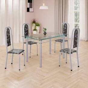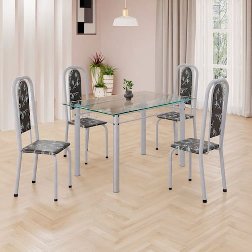 Este conjunto de mesa retangular e 4 cadeiras oferece estilo e praticidade. Com estrutura tubular em aço para estabilidade, o tampo em vidro adiciona sofisticação e resistência a riscos e manchas. As cadeiras combinam harmoniosamente com a mesa, garantindo conforto com estofamento. Ideal para diversos espaços, é perfeito para receber convidados ou desfrutar de refeições em família, criando um ambiente acolhedor e elegante. Medida da Mesa (A x L x P): 74,9 cm x 75 cm x 120 cm Peso da Mesa: 20,18 kg Mesa suporta até: 10 kg Acabamento da Cadeira/Banco: Pintura Texturizada Acabamento da Mesa: Polido Ambiente Principal: Sala de Jantar Cadeira/Banco estofada: Somente Assento Estofado Cadeira/Banco suporta até: 120 kg Complexidade da Montagem: Baixa: pode ser montado por uma pessoa sozinha Cor: Preto Floral/ Mart Pérola Cor do Produto: Preto Floral/ Mart Pérola Escala de Brilho: Semi-Brilho Espessura do Tampo: 6 mm Estrutura do Assento: Assento em MDP de 15mm c/ couríssimo. Itens Inclusos: 1 Mesa, 4 Cadeiras, Manual de Montagem e Ferragens. Manual de Montagem e Instalação: https://product-hub-prd.madeiramadeira.com.br/917892/documents/908ed95e-bef8-4c4a-bfbf-5c08c38cb0182040633524617181306017506.pdf Material da Base da Mesa: Aço Material da Estrutura da Cadeira: Aço Material do Tampo: Vidro Medida da Cadeira/Banco (A x L x P): 108 cm x 37 cm x 40 cm Medida do Tampo (L x C x E): 75 cm x 120 cm x 0,6 cm Necessita Montagem: Sim Origem do Produto: Nacional Peso da Cadeira/Banco: 3,82 kg Possui Apoio Para os Pés: Não Quantidade de Lugares: 04 Recomendações de Uso, Manutenção e Limpeza: Usar um pano de tecido macio e seco, evitar detergentes, alvejantes e produtos químicos de limpeza; no tampo usar tecido macio levemente umedecido. Sistema de Montagem: Parafusos Vidro Temperado: Sim