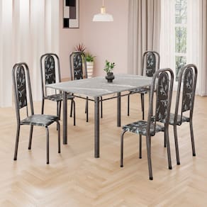 Este conjunto de mesa retangular e 6 cadeiras oferece estilo e praticidade. Com estrutura tubular em aço para estabilidade, o tampo em pedra granito adiciona sofisticação e resistência a riscos e manchas. As cadeiras combinam harmoniosamente com a mesa, garantindo conforto com estofamento. Ideal para diversos espaços, é perfeito para receber convidados ou desfrutar de refeições em família, criando um ambiente acolhedor e elegante. Medida da Mesa (A x L x P): 75,8 cm x 75 cm x 140 cm Peso da Mesa: 65,95 kg Mesa suporta até: 10 kg Acabamento da Cadeira/Banco: Pintura Texturizada Acabamento da Mesa: Polido Ambiente Principal: Sala de Jantar Cadeira/Banco estofada: Encosto e Assento Estofados Cadeira/Banco suporta até: 120 kg Complexidade da Montagem: Baixa: pode ser montado por uma pessoa sozinha Cor: Preto Floral/ Mart Prata Cor do Produto: Preto Floral/ Mart Prata Escala de Brilho: Semi-Brilho Espessura do Tampo: 15 mm Estrutura do Assento: Assento em MDP de 15mm c/ couríssimo. Itens Inclusos: 1 Mesa, 6 Cadeiras, Manual De Montagem E Ferragens. Linha ou Coleção: Lavínea Manual de Montagem e Instalação: https://product-hub-prd.madeiramadeira.com.br/914296/documents/4645eb11-b400-442a-bb10-dd8593cb5de62040633524617181306017506.pdf Material da Base da Mesa: Aço Material da Estrutura da Cadeira: Aço Material do Tampo: Granito Medida da Cadeira/Banco (A x L x P): 108 cm x 37 cm x 40 cm Medida do Tampo (L x C x E): 75 cm x 140 cm x 1,5 cm Necessita Montagem: Sim Origem do Produto: Nacional Peso da Cadeira/Banco: 3,82 kg Possui Apoio Para os Pés: Não Quantidade de Lugares: 06 Recomendações de Uso, Manutenção e Limpeza: Usar um pano de tecido macio e seco, evitar detergentes, alvejantes e produtos químicos de limpeza; no tampo usar tecido macio levemente umedecido. Sistema de Montagem: Parafusos