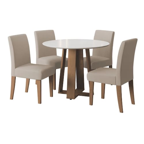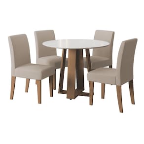 O conjunto de Mesa Athenas Redonda 1,03m 4 Cadeiras Trieste é perfeito para compor sua cozinha, sala de jantar ou área gourmet. A mesa possui acabamento em verniz Vitreo, que forma uma camada transparente de alta resistência que garante mais qualidade ao produto. O design dos pés da mesa em X facilita acomodar melhor as cadeiras no seu espaço. As cadeiras são revestidas em tecido Veloplus toque macio e confortável na cor Areia. Excelente para receber os amigos e familiares, tornando o momento ainda mais especial!