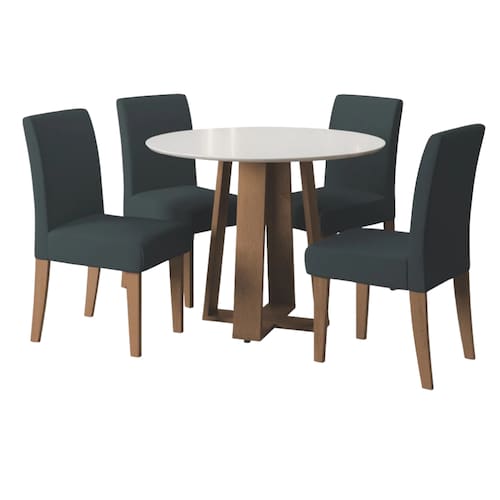 O conjunto de Mesa Athenas Redonda 1,03m 4 Cadeiras Trieste é perfeito para compor sua cozinha, sala de jantar ou área gourmet. A mesa possui acabamento em verniz Vitreo, que forma uma camada transparente de alta resistência que garante mais qualidade ao produto. O design dos pés da mesa em X facilita acomodar melhor as cadeiras no seu espaço. As cadeiras são revestidas em tecido Veloplus toque macio e confortável na cor Chumbo. Excelente para receber os amigos e familiares, tornando o momento ainda mais especial!