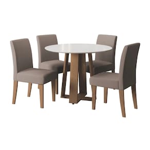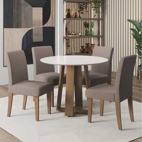 O conjunto de Mesa Athenas Redonda 1,03m 4 Cadeiras Trieste é perfeito para compor sua cozinha, sala de jantar ou área gourmet. A mesa possui acabamento em verniz Vitreo, que forma uma camada transparente de alta resistência que garante mais qualidade ao produto. O design dos pés da mesa em X facilita acomodar melhor as cadeiras no seu espaço. As cadeiras são revestidas em tecido Veloplus toque macio e confortável na cor Mascavo. Excelente para receber os amigos e familiares, tornando o momento ainda mais especial!