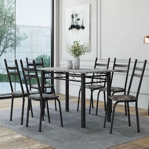 O Conjunto de Mesa Leia com 6 Cadeiras foi desenvolvido para trazer ainda mais beleza, conforto e praticidade ao seu lar. A mesa possui tampo retangular em granito natural, material nobre e resistente a altas temperaturas, perfeito para apoiar panelas e travessas sem preocupação. Seu design combina elegância e funcionalidade, tornando o ambiente mais sofisticado. As cadeiras são estofadas com tecido sintético de fácil limpeza, unindo conforto no sentar com a praticidade do dia a dia. O acabamento proporciona toque macio e visual moderno, adaptando-se facilmente a diferentes estilos de decoração. A estrutura da mesa e das cadeiras é feita em aço de alta qualidade, garantindo estabilidade, resistência e longa durabilidade