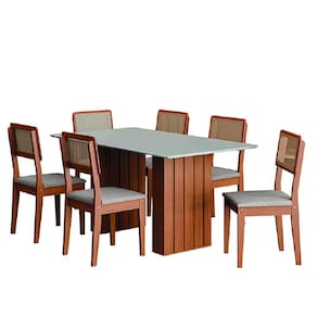 MEDIDAS: Medidas Mesa: [ A ] = 80 cm [ L ] = 160 cm [ P ] = 90 cm Medidas Cadeiras (cada): [ A ] = 92 cm [ L ] = 46 cm [ P ] = 40 cm PESO MESA: 61,90 Kg PESO CADEIRA: 6,60 Kg (cada) PESO SUPORTADO MESA: 20 Kg (distribuídos) PESO SUPORTADO CADEIRA: 110 Kg cada MODELO: Conjunto de Mesa Sala de Jantar Ripada Tampo com Vidro 1,60m 6 Cadeiras Santiago MARCA: Dobuê ESTRUTURA: MDF ACABAMENTO MESA: Pintura UV ACABAMENTO CADEIRA: Veluplus TECIDO DA CADEIRA: Linho REVESTIMENTO ASSENTO E ENCOSTO DA CADEIRA: Espuma D20 MATERIAL DO TAMPO: MDF TAMPO COM VIDRO: Sim PÉS DA CADEIRA: Sapatas Plásticas DIFERENCIAL: Material em MDF de alta resistência, tampo com vidro e base ripada, encosto da cadeira com tela. SISTEMA DE MONTAGEM: Parafusos e porcas cilíndricas ITENS INCLUSOS: 1 Mesa e 6 cadeiras, 1 manual de montagem e 1 kit parafusos INSTRUÇÕES E CUIDADOS: Limpar com pano levemente umedecido com água, não utilizar produtos abrasivos GARANTIA: 3 meses pelo fabricante