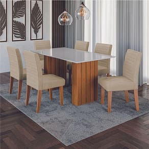 MODELO: Conjunto de Mesa Sala de Jantar Ripada Tampo com Vidro Santiago 1,60m 6 Cadeiras Creta
