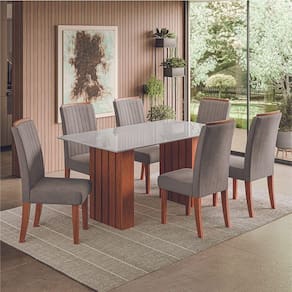 O conjunto de mesa Santiago 1,60m com 6 cadeiras Grécia é a escolha perfeita para cozinhas e salas de jantar que buscam conforto e estilo. A mesa possui tampo de vidro temperado colado, e conta com base dupla ripada, que traz um visual moderno e sofisticado ao ambiente. A Cadeira Grécia é uma peça de destaque que traz estilo e conforto para o seu espaço. Com assento acolchoado e encosto bordado com espaldar, ela é revestida com tecido Veluplus de alta qualidade, que oferece toque macio e durabilidade excepcional. Feita com materiais resistentes e fáceis de limpar, a cadeira recebe um acabamento com quatro camadas de proteção, garantindo maior durabilidade e resistência.