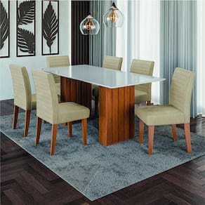 O conjunto de mesa Santiago 1,80m com 6 cadeiras Creta é a escolha perfeita para cozinhas e salas de jantar que buscam conforto e estilo. A mesa possui tampo de vidro temperado colado, e conta com base dupla ripada, que traz um visual moderno e sofisticado ao ambiente. As cadeiras oferecem assento e encosto acolchoado e revestido com tecido Veluplus de alta qualidade, a cadeira oferece toque macio e durabilidade excepcional. Feita com materiais resistentes e fáceis de limpar, garantindo maior durabilidade e resistência.