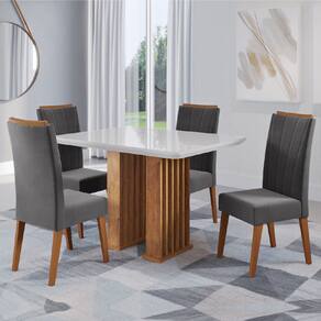 DIFERENCIAL: Tampo da mesa com vidro e bordas arredondadas, base ripada sofistica. Cadeira com base em madeira maciça encosto acolchoado, e espalda, revestimento em tecido veludo
