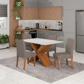 O Conjunto de Mesa Grécia com 4 cadeiras Trieste é perfeito para compor sua cozinha ou Sala de Jantar. A mesa possui base com design moderno, e tampo em MDF com vidro temperado, que forma uma camada transparente de alta resistência que garante mais qualidade além de deixar seu ambiente mais sofisticado. Já as cadeiras, com estrutura em MDF e revestimento em tecido Veluplus, oferecem um toque suave e aconchegante. Os assentos e encostos são acolchoados com espuma de alta qualidade, proporcionando máximo conforto.