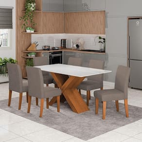 O Conjunto de Mesa Grécia com 6 cadeiras Trieste é perfeito para compor sua cozinha ou Sala de Jantar. A mesa possui base com design moderno, e tampo em MDF com vidro temperado, que forma uma camada transparente de alta resistência que garante mais qualidade além de deixar seu ambiente mais sofisticado. Já as cadeiras, com estrutura em MDF e revestimento em tecido Veluplus, oferecem um toque suave e aconchegante. Os assentos e encostos são acolchoados com espuma de alta qualidade, proporcionando máximo conforto.